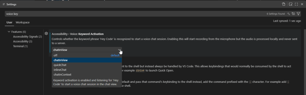 Open VS Code Settings (Ctrl + ,) and search for “voice keyword”.