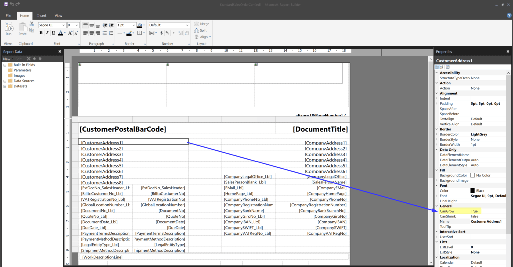 You can then see with the pink line how this shifts the entire layout down. This may not be a big deal when you only have one sales line, but if your report layout has a very specific size (say, on a Bill of Lading, or Label report), this could push your report from one to two pages. If your report layout is limited with real estate, and you can’t expand the text box size to accommodate all 100 characters, we have one more option. We can change the CanGrow property to False.