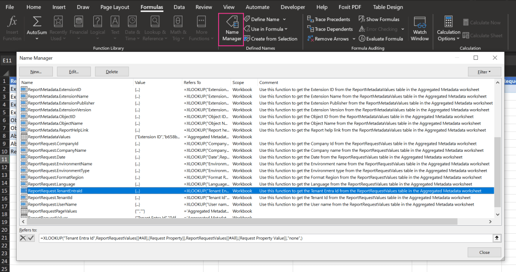 One other new addition in BC25 Excel Report Layouts are named formulas. Microsoft added these formulas so we don’t have to write complex XLookups or formulas. To view these formulas, within the ribbon click the tab for Formulas > Name Manager. In the screenshot below you can see the new named formula for ReportRequest.TenantEntraId