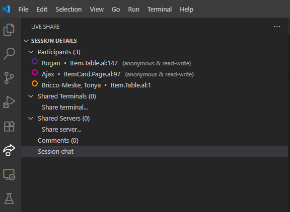 If you would like to share your code, from your Activity Bar along the left side of VS Code, click the Live Share logo. You can then Share (Read/Write) or Share (Read-Only). Clicking either of these options will start a Live Share session, and copies the URL to your clipboard. You can then easily share this link with up to 30 individuals you would like to collaborate with.