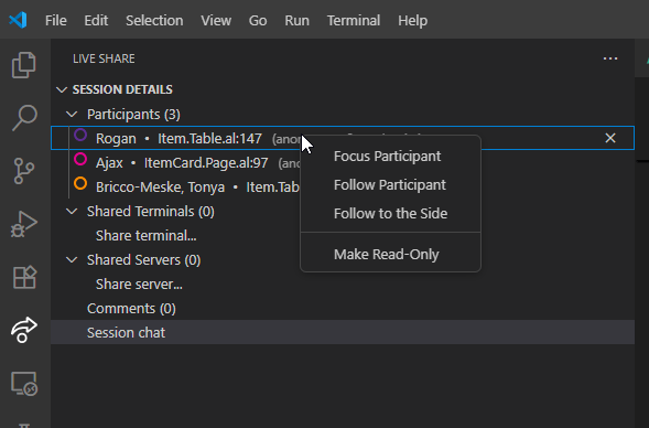 You can Follow Participant, or even Follow to the side. What this does is opens Rogan’s view of the code in another tab to the right. I can keep working on my code, but can also see what he is doing within the same window of VS Code.