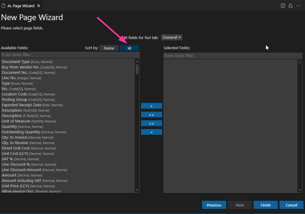 So let’s say we are creating an API page for the Purchase Line table (this is actually the table used in my screenshot above). You can see when sorted by ID, the order of fields is