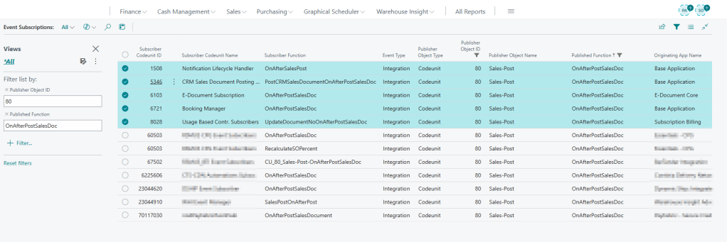 In the image above you see the Subscriber Function is filtered for OnAfterPostSalesDoc. The first five apps are all from Microsoft. The remaining event subscribers are from PTEs or AppSource Apps.