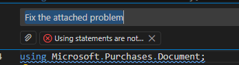 For this specific example I could use the Quick Fix and sort the using statements. Otherwise I can also open the inline Copilot and ask it to fix the problem.