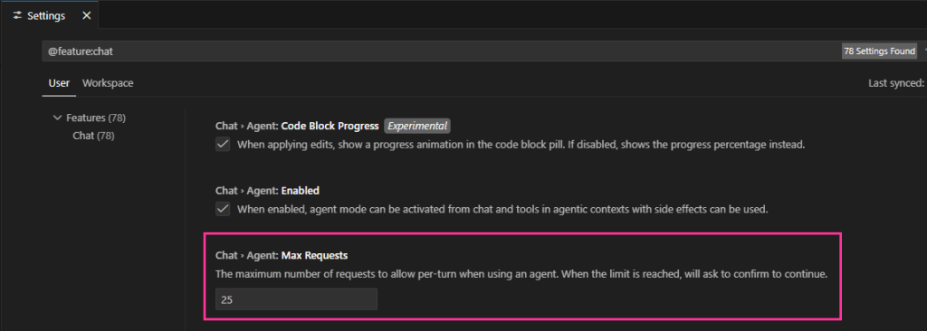 [NOTE]: When working in Agent mode, GitHub Copilot’s default limit for Max Requests is 25. What this means is after sending/receiving 25 “requests” aka messages / tokens, GHC will require your intervention. I would suggest increasing the Max Requests to 100 so you can maintain a good development workflow.