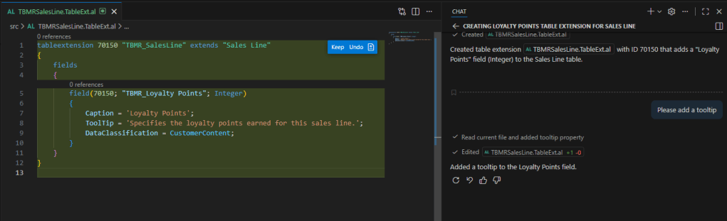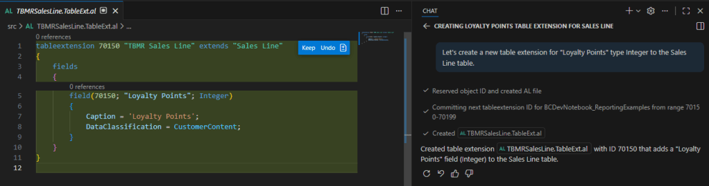 The Agent reviewed the object number range from the app.json, and was able to create a new table extension object. You can see that I am being asked if I would like to keep or undo the changes.
