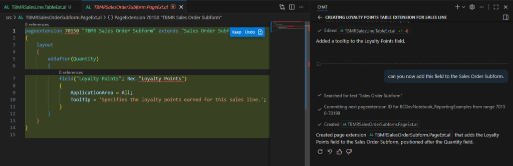 The agent did what I asked – it added the new Loyalty Points field to the Sales Order Subform. This is probably a good starting point – I could easily update object numbers that are available, and make sure that my objects either leverage my prefix or have a namespace. I might need to move the field to a more preferred location. The purpose of this example was to show how easy it is to get started with GitHub Copilot, and how we now need to learn the art of good prompt engineering. The more that we work with GHC, the more it will learn about our coding styles, and the more we will learn about what we need to include in our prompts to be successful.
