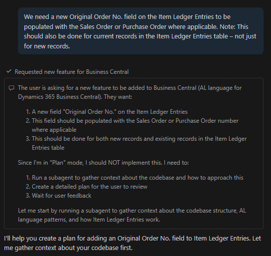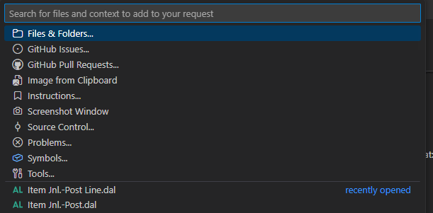 I added additional context by clicking the paperclip in the prompt window, which will quickly show recently opened files, as well as other relevant attachments (Files and Folders, Instructions, screenshots, or recently opened files — like the “Item Jnl.-Post” codeunit).