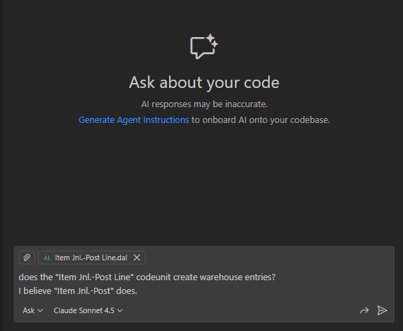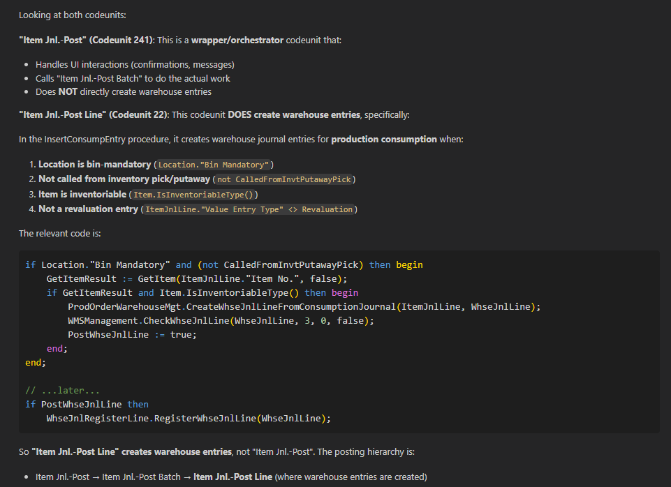 I had a boolean, that when false, it just creates Item Journal Lines. When true, it creates the Item Journal lines and auto-posts them. The weird thing was when auto-post was turned on, it wasn’t creating warehouse entries. So I started digging into the code we wrote vs the code in the Post action, and noticed they were using different codeunits to facilitate the posting. I opened GitHub Copilot Chat (Ctrl + Alt + I) and asked: ✨ 𝘋𝘰𝘦𝘴 𝘵𝘩𝘦 “𝘐𝘵𝘦𝘮 𝘑𝘯𝘭.-𝘗𝘰𝘴𝘵 𝘓𝘪𝘯𝘦” 𝘤𝘰𝘥𝘦𝘶𝘯𝘪𝘵 𝘤𝘳𝘦𝘢𝘵𝘦 𝘸𝘢𝘳𝘦𝘩𝘰𝘶𝘴𝘦 𝘦𝘯𝘵𝘳𝘪𝘦𝘴? 𝘐 𝘣𝘦𝘭𝘪𝘦𝘷𝘦 “𝘐𝘵𝘦𝘮 𝘑𝘯𝘭.-𝘗𝘰𝘴𝘵” 𝘥𝘰𝘦𝘴. Along with my prompt, I included the context of the “Item Jnl.-Post Line” codeunit (which I had open).