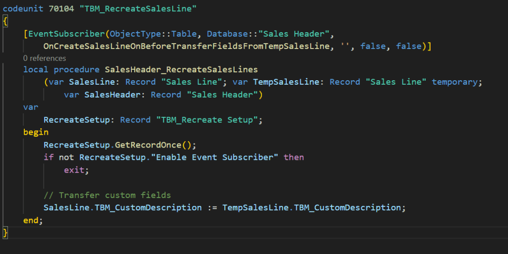 I’m going to get my setup record. If “Enable Event Subscriber” is false, I’m going to exit (and not copy my Custom Description). Otherwise, I will copy the Custom Description from the TempSalesLine to the “new” Sales Line.
